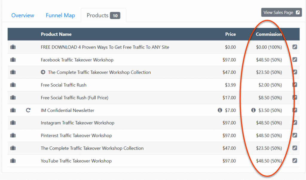But I also have my own traffic offer listed on WarriorPlus. It’s a free product meaning it’s a very easy sell, but it has paid offers included in the funnel which pay out 50% commissions – the image below shows the full list.