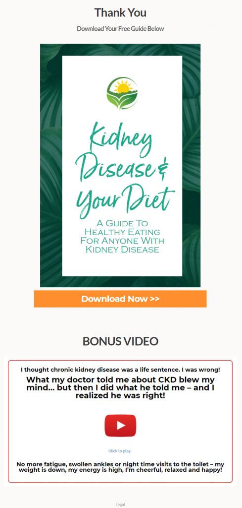 This is for the same top kidney disease Clickbank product as promoted in your free report. Remember the 95% who don’t buy first time round? This means that you catch many, many more of these. Why not have the affiliate payments go into your Clickbank account, rather than someone else’s?